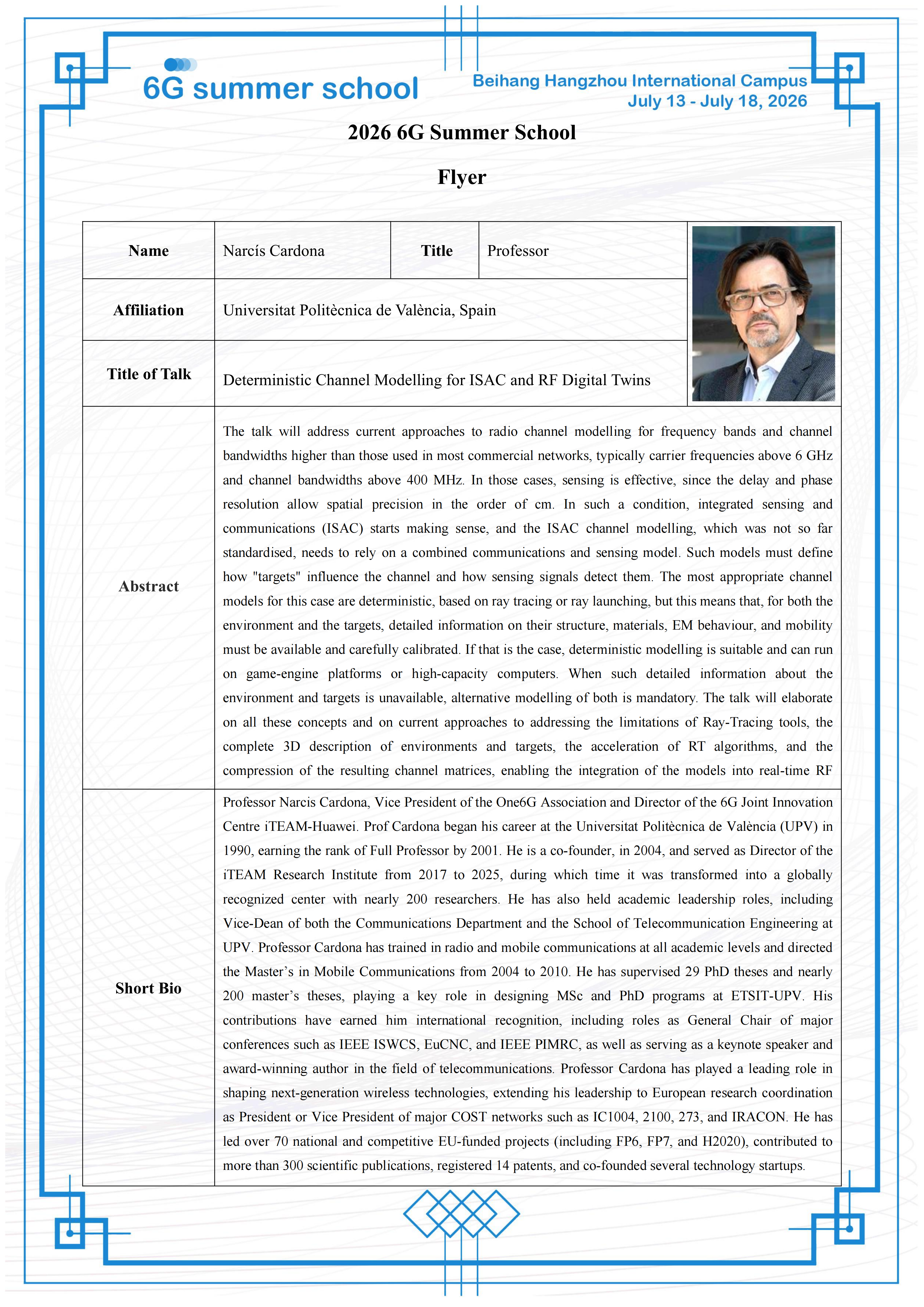 Professor Narcis Cardona, Vice President of the One6G Association and Director of the 6G Joint Innovation Centre iTEAM-Huawei. Prof Cardona began his career at the Universitat Politècnica de València (UPV) in 1990, earning the rank of Full Professor by 2001. He is a co-founder, in 2004, and served as Director of the iTEAM Research Institute from 2017 to 2025, during which time it was transformed into a globally recognized center with nearly 200 researchers. He has also held academic leadership roles, including Vice-Dean of both the Communications Department and the School of Telecommunication Engineering at UPV. Professor Cardona has trained in radio and mobile communications at all academic levels and directed the Master’s in Mobile Communications from 2004 to 2010. He has supervised 29 PhD theses and nearly 200 master's theses, playing a key role in designing MSc and PhD programs at ETSIT-UPV. His contributions have earned him international recognition, including roles as General Chair of major conferences such as IEEE ISWCS, EuCNC, and IEEE PIMRC, as well as serving as a keynote speaker and award-winning author in the field of telecommunications. Professor Cardona has played a leading role in shaping next-generation wireless technologies, extending his leadership to European research coordination as President or Vice President of major COST networks such as IC1004, 2100, 273, and IRACON. He has led over 70 national and competitive EU-funded projects (including FP6, FP7, and H2020), contributed to more than 300 scientific publications, registered 14 patents, and co-founded several technology startups.