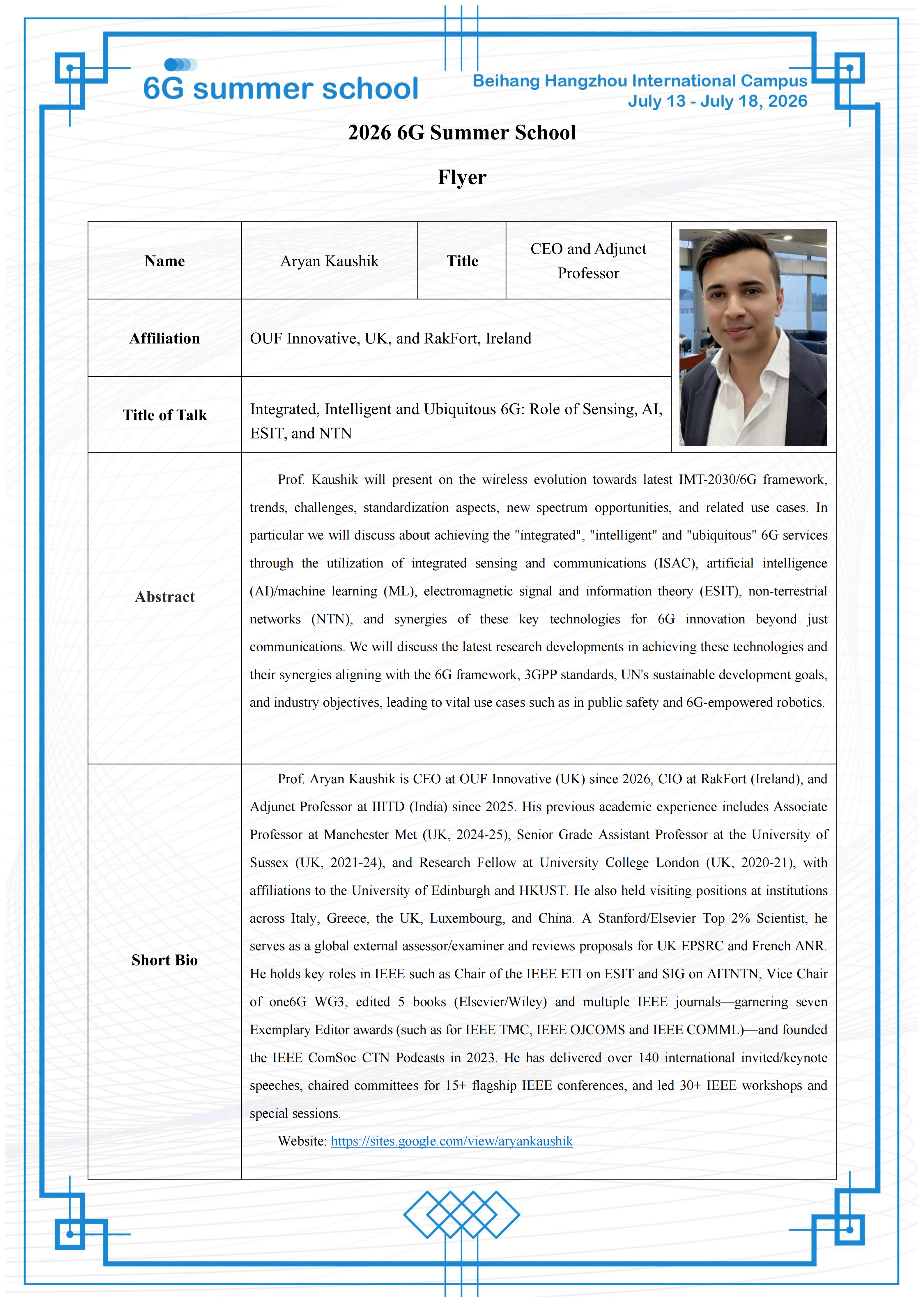 Prof. Aryan Kaushik is CEO at OUF Innovative (UK) since 2026, CIO at RakFort (Ireland), and Adjunct Professor at IIITD (India) since 2025. His previous academic experience includes Associate Professor at Manchester Met (UK, 2024-25), Senior Grade Assistant Professor at the University of Sussex (UK, 2021-24), and Research Fellow at University College London (UK, 2020-21), with affiliations to the University of Edinburgh and HKUST. He also held visiting positions at institutions across Italy, Greece, the UK, Luxembourg, and China. A Stanford/Elsevier Top 2% Scientist, he serves as a global external assessor/examiner and reviews proposals for UK EPSRC and French ANR. He holds key roles in IEEE such as Chair of the IEEE ETI on ESIT and SIG on AITNTN, Vice Chair of one6G WG3, edited 5 books (Elsevier/Wiley) and multiple IEEE journals—garnering seven Exemplary Editor awards (such as for IEEE TMC, IEEE OJCOMS and IEEE COMML)—and founded the IEEE ComSoc CTN Podcasts in 2023. He has delivered over 140 international invited/keynote speeches, chaired committees for 15+ flagship IEEE conferences, and led 30+ IEEE workshops and special sessions.