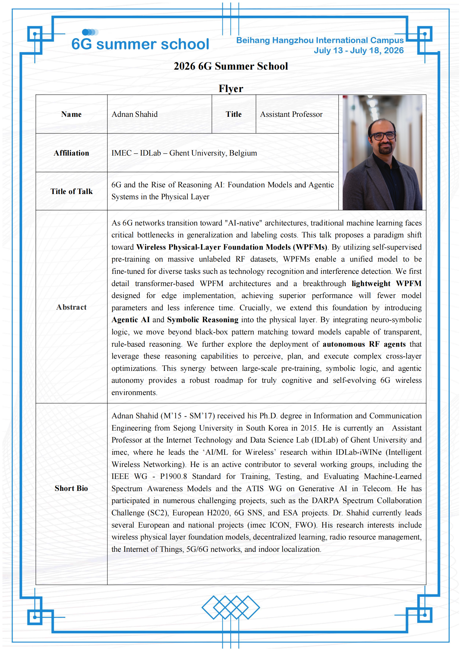 Adnan Shahid (M'15 - SM'17) received his Ph.D. degree in Information and Communication Engineering from Sejong University in South Korea in 2015. He is currently an Assistant Professor at the Internet Technology and Data Science Lab (IDLab) of Ghent University and imec, where he leads the 'AI/ML for Wireless' research within IDLab-iWINe (Intelligent Wireless Networking). He is an active contributor to several working groups, including the IEEE WG - P1900.8 Standard for Training, Testing, and Evaluating Machine-Learned Spectrum Awareness Models and the ATIS WG on Generative AI in Telecom. He has participated in numerous challenging projects, such as the DARPA Spectrum Collaboration Challenge (SC2), European H2020, 6G SNS, and ESA projects. Dr. Shahid currently leads several European and national projects (imec ICON, FWO). His research interests include wireless physical layer foundation models, decentralized learning, radio resource management, the Internet of Things, 5G/6G networks, and indoor localization.