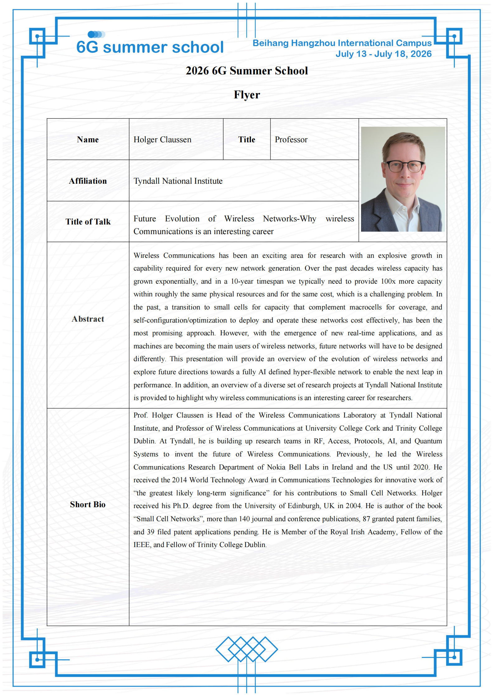Prof. Holger Claussen is Head of the Wireless Communications Laboratory at Tyndall National Institute, and Professor of Wireless Communications at University College Cork and Trinity College Dublin. At Tyndall, he is building up research teams in RF, Access, Protocols, AI, and Quantum Systems to invent the future of Wireless Communications. Previously, he led the Wireless Communications Research Department of Nokia Bell Labs in Ireland and the US until 2020. He received the 2014 World Technology Award in Communications Technologies for innovative work of “the greatest likely long-term significance” for his contributions to Small Cell Networks. Holger received his Ph.D. degree from the University of Edinburgh, UK in 2004. He is author of the book “Small Cell Networks”, more than 140 journal and conference publications, 87 granted patent families, and 39 filed patent applications pending. He is Member of the Royal Irish Academy, Fellow of the IEEE, and Fellow of Trinity College Dublin.