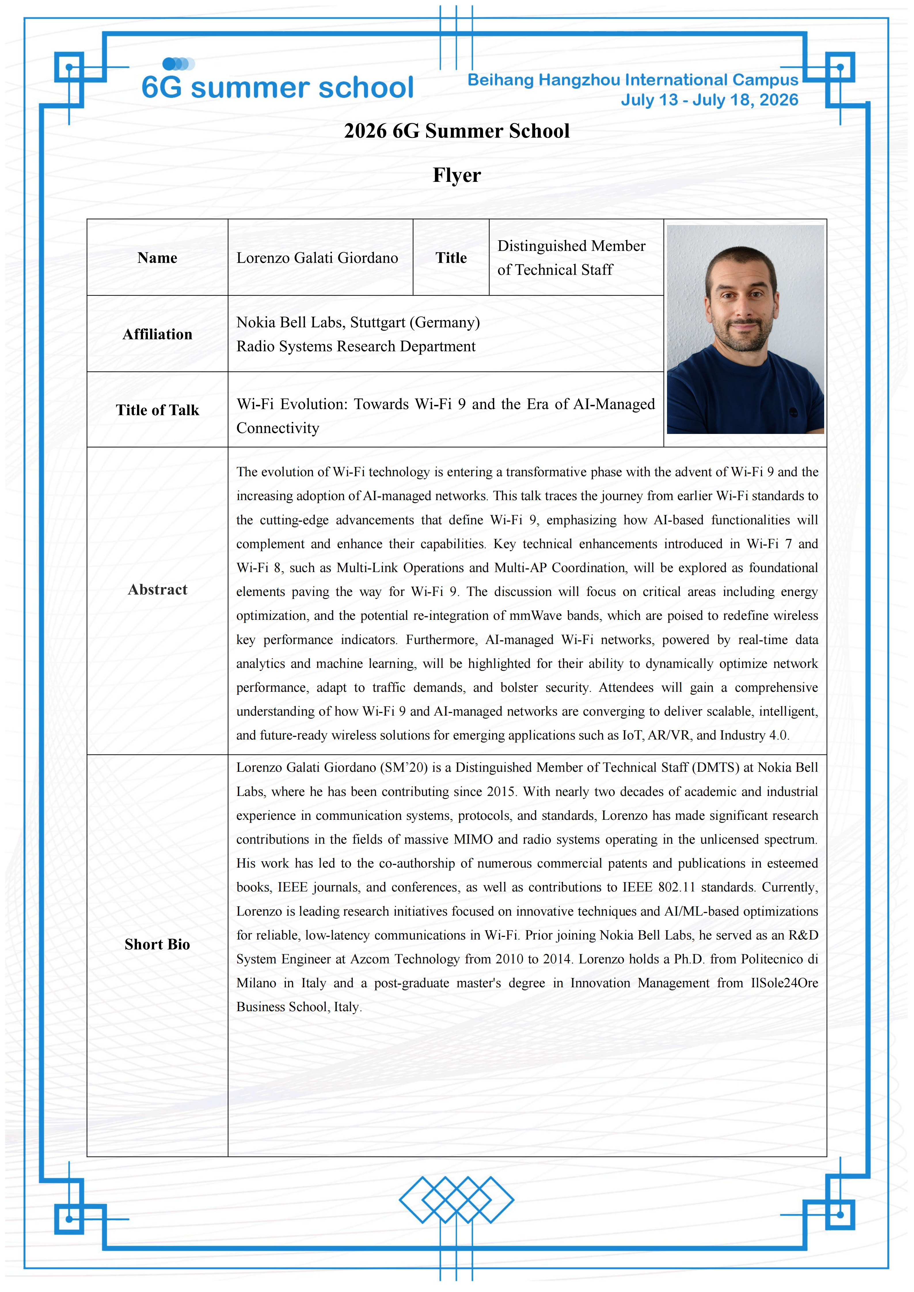 The evolution of Wi-Fi technology is entering a transformative phase with the advent of Wi-Fi 9 and the increasing adoption of AI-managed networks. This talk traces the journey from earlier Wi-Fi standards to the cutting-edge advancements that define Wi-Fi 9, emphasizing how AI-based functionalities will complement and enhance their capabilities. Key technical enhancements introduced in Wi-Fi 7 and Wi-Fi 8, such as Multi-Link Operations and Multi-AP Coordination, will be explored as foundational elements paving the way for Wi-Fi 9. The discussion will focus on critical areas including energy optimization, and the potential re-integration of mmWave bands, which are poised to redefine wireless key performance indicators. Furthermore, AI-managed Wi-Fi networks, powered by real-time data analytics and machine learning, will be highlighted for their ability to dynamically optimize network performance, adapt to traffic demands, and bolster security. Attendees will gain a comprehensive understanding of how Wi-Fi 9 and AI-managed networks are converging to deliver scalable, intelligent, and future-ready wireless solutions for emerging applications such as IoT, AR/VR, and Industry 4.0.