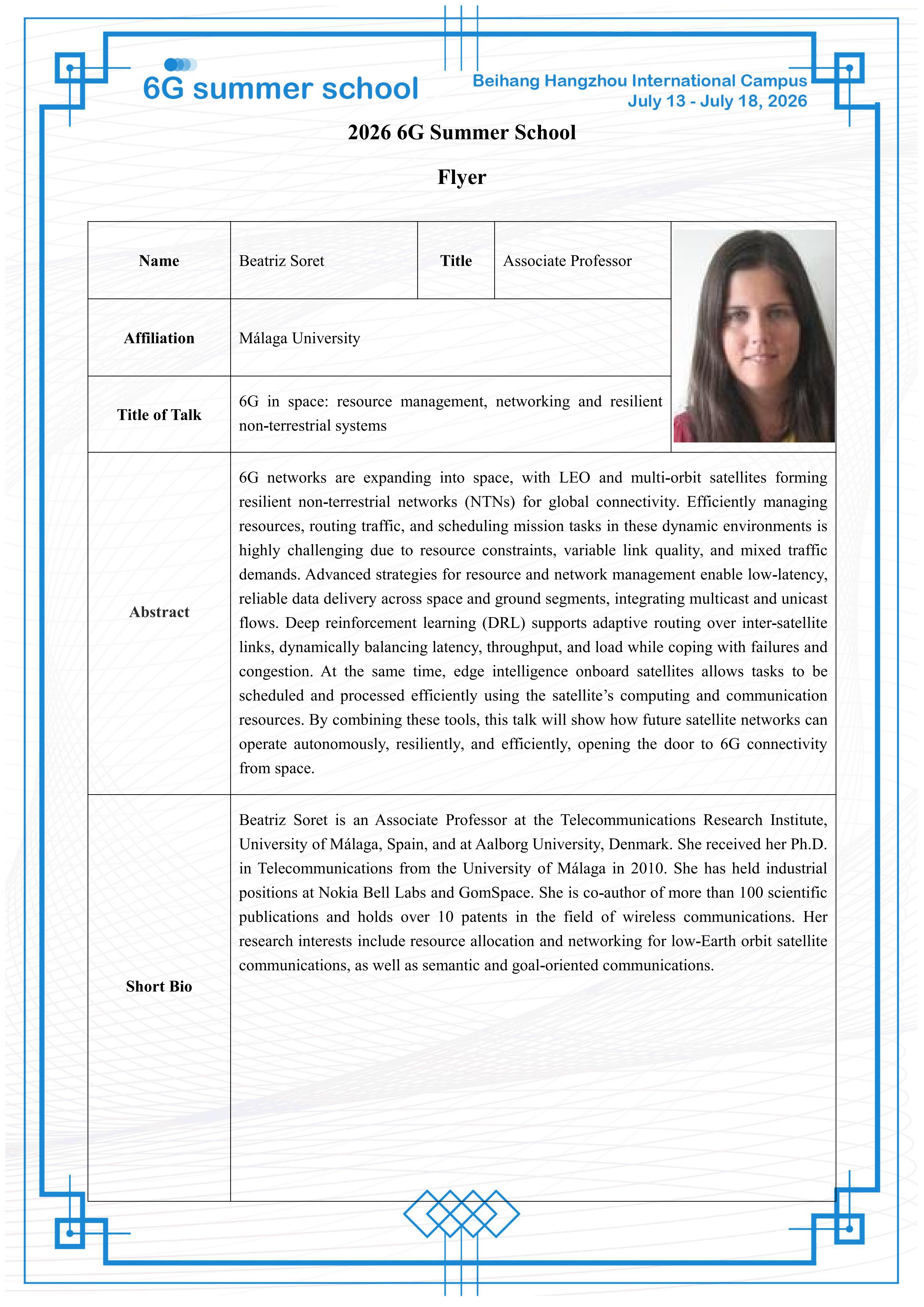Beatriz Soret is an Associate Professor at the Telecommunications Research Institute, University of Málaga, Spain, and at Aalborg University, Denmark. She received her Ph.D. in Telecommunications from the University of Málaga in 2010. She has held industrial positions at Nokia Bell Labs and GomSpace. She is co-author of more than 100 scientific publications and holds over 10 patents in the field of wireless communications. Her research interests include resource allocation and networking for low-Earth orbit satellite communications, as well as semantic and goal-oriented communications.